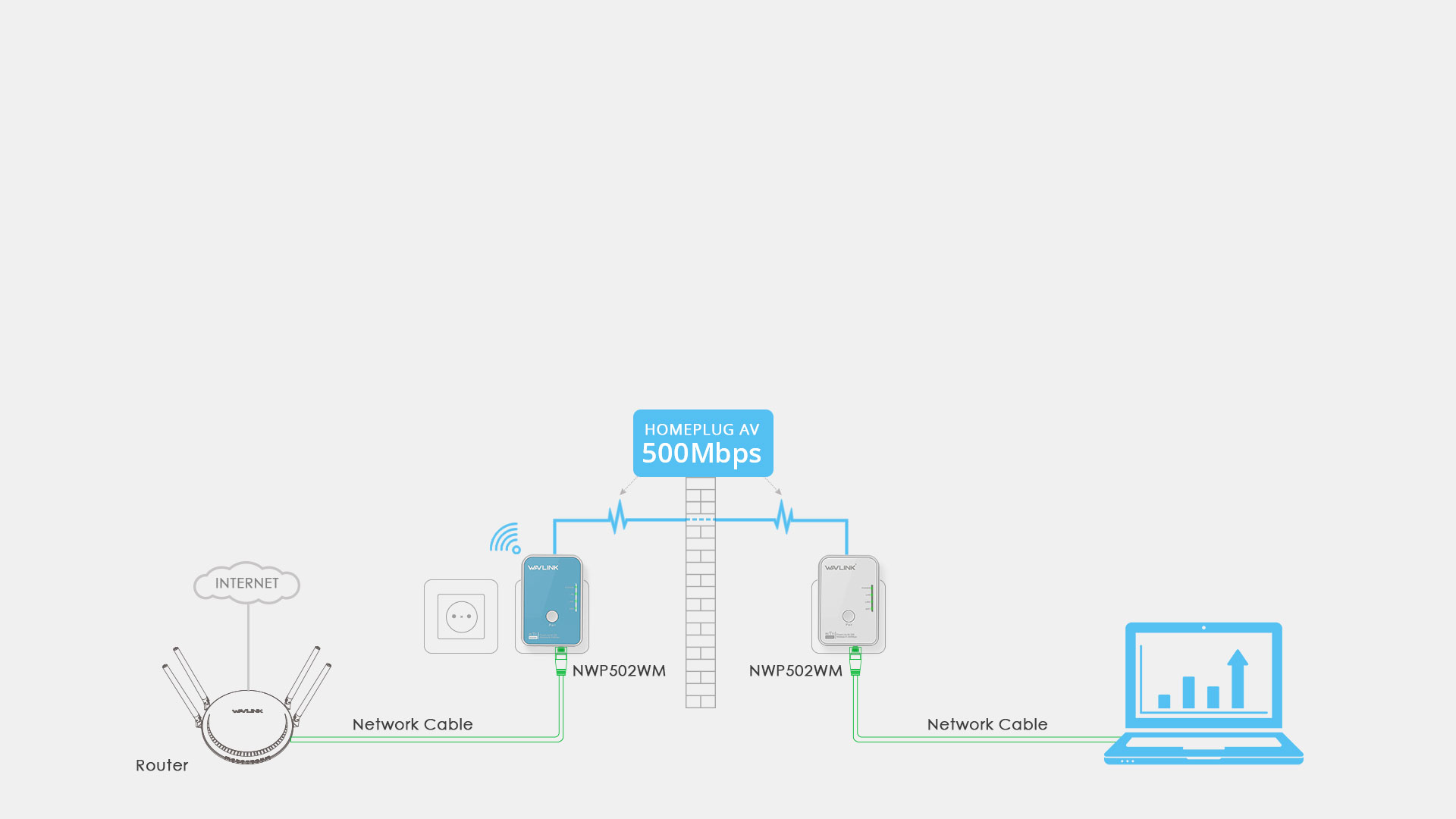 Connect a set of powerline kit to the laptop and the router respectively and Pair them both, then your Wi-Fi signal is much more strengthened. 502WM is able to send data through walls to avoid severe signal loss. With Homeplug AV standard, the data transmission rate reaches as fast as 500Mbps.