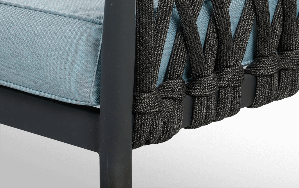 לספה מבנה אלומיניום עמיד, בשילוב חבלי קליעה שמעניקים לה מראה ייחודי ומרקם עשיר. כריות הישיבה מבטיחות חוויית ישיבה מפנקת לאורך זמן.