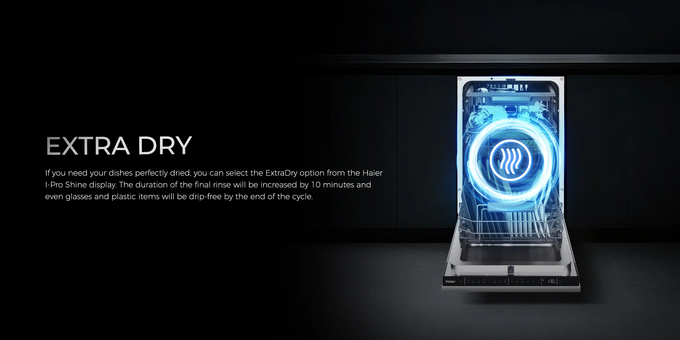 ExtraDry מאריך את זמן השטיפה הסופי ב-10 דקות, מה שמבטיח ייבוש מושלם של הכלים.