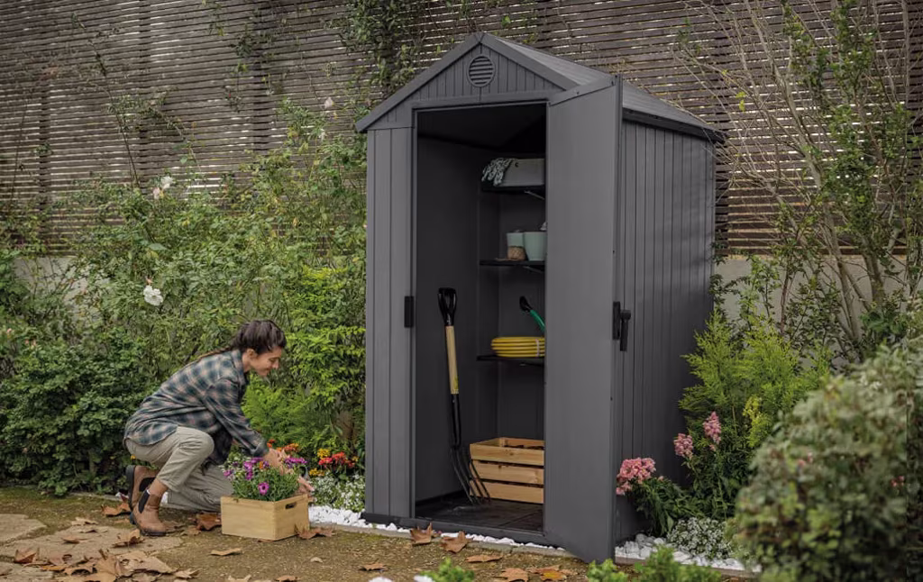 מחסן גינה דארווין 4×4- פתרון אחסון אידיאלי לחצר או מרפסת קטנה. קירות המחסן עשויים מחומר Evotech המתקדם במראה עץ עם דופן כפולה בחיזוק פלדה, פתחי אוורור ודפנות חזקות שהופכות אותו לפתרון אחסון מושלם. קל ומהיר להרכבה, וכולל רצפה חזקה. המחסן מעוצב באופן נוח ביותר להובלה עצמאית הודות לאריזה קומפקטית הניתנת להובלה ברכב פרטי.