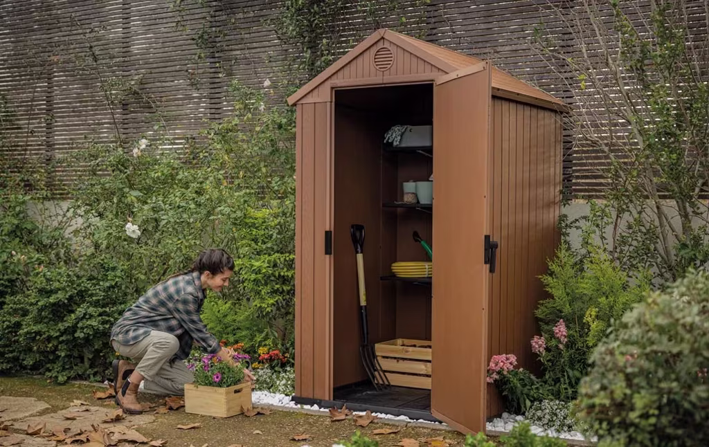 מחסן גינה דארווין 4×4- פתרון אחסון אידיאלי לחצר או מרפסת קטנה. קירות המחסן עשויים מחומר Evotech המתקדם במראה עץ עם דופן כפולה בחיזוק פלדה, פתחי אוורור ודפנות חזקות שהופכות אותו לפתרון אחסון מושלם. קל ומהיר להרכבה, וכולל רצפה חזקה. המחסן מעוצב באופן נוח ביותר להובלה עצמאית הודות לאריזה קומפקטית הניתנת להובלה ברכב פרטי.