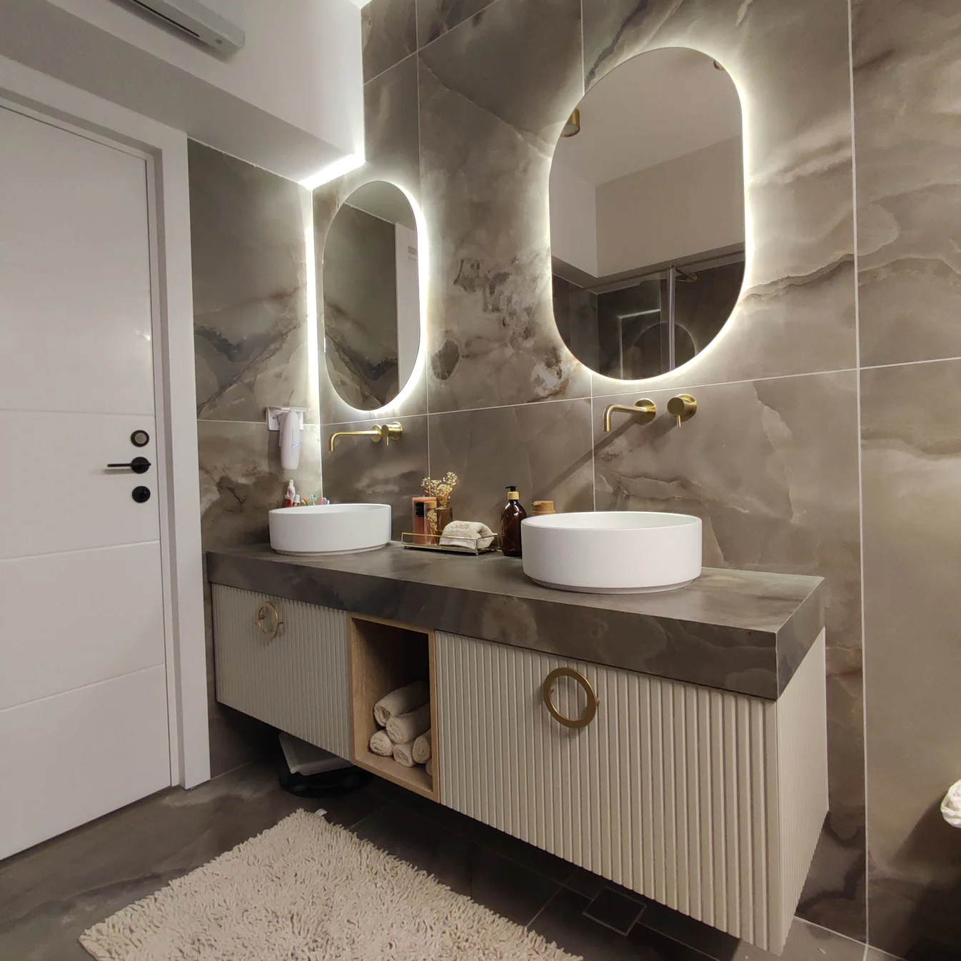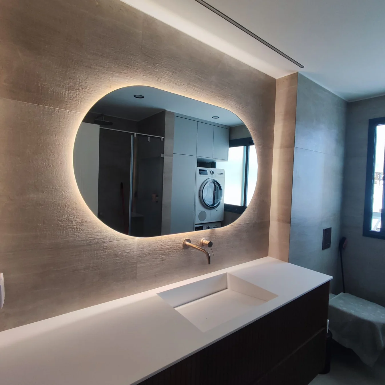 מראה קריסטל בלגית מרחפת עם תאורת לד אחורית – גוון תאורה לבחירת הלקוח (אור חם או אור יום ) פס לד סגור בתוך מסגרת פרספקס שנותן מראה נקי ואטימה מושלמת והופכת את התאורה למוגנת מים 100%
