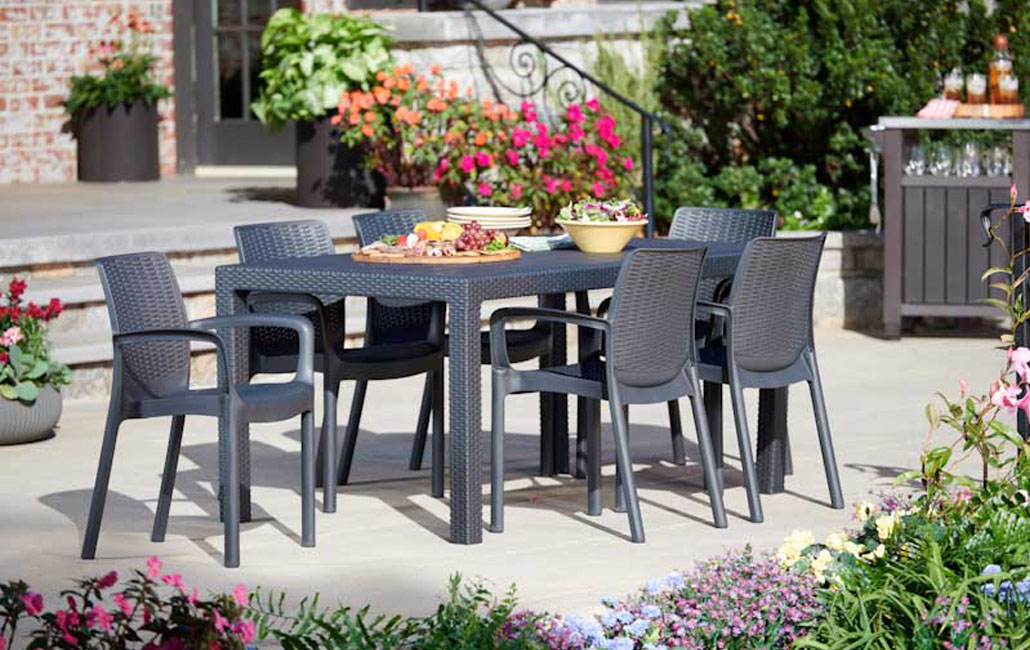 סט באלי הכולל שולחן ו 6 כיסאות הוא תוספת אלגנטית לכל גינה או מרפסת ויתאים בצורה מושלמת לארוחה קלה בגינה בימי השמש הנעימים. לשולחן פתח מתאים לשמשייה גדולה, להגנה בימים החמים. מראה קלאסי בטקסטורה דמויית ראטן ארוג. השולחן והכיסאות האיכותיים עמידים בפני פגעי מזג האוויר.
