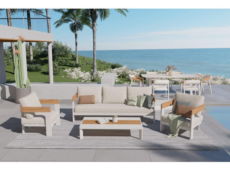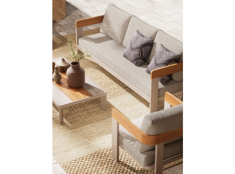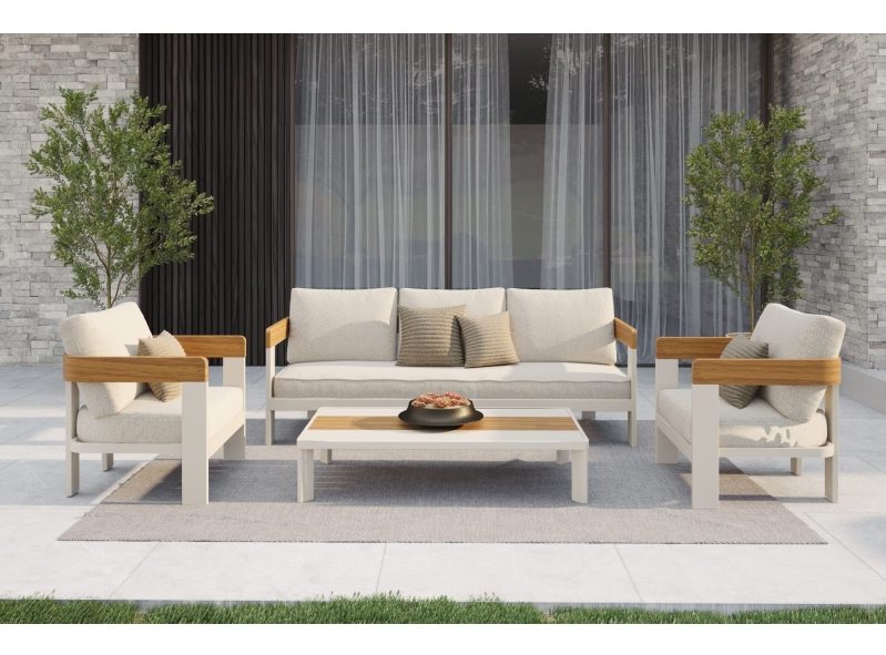 הסט מגיע בצבע אבן בשילוב גוון עץ טבעי, הריפוד בגוון בז’