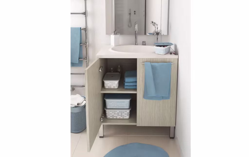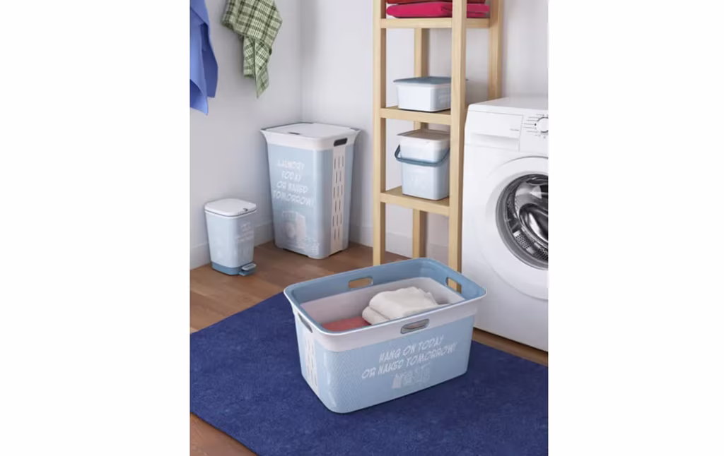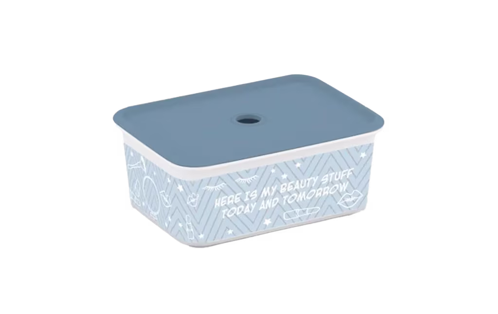 קופסת אחסון עם מכסה מתאימה לאחסון חפצים בחדר הכביסה או חדר האמבטיה. מסייעת לעשות סדר במגירות ובאזורי האחסנה.